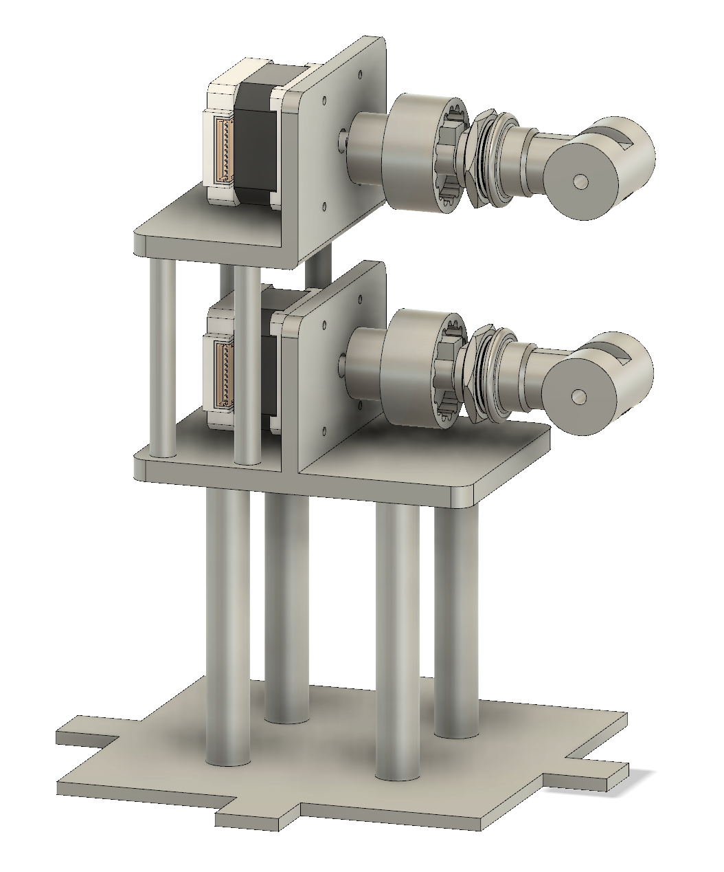 I utilized two stepper motors to control each of the humid and dry air lines. I designed a stand for the motors and an adapter for the shaft to the valve handle in CAD and 3D printed them. I drove the motors at .8A each with A4988 drivers, and microstepped the motors to 3200 steps/revolution. The microstepping gave the advantage of significantly quieter operation alongside the increased resolution (although 3200 steps/revolution was much more than necessary).