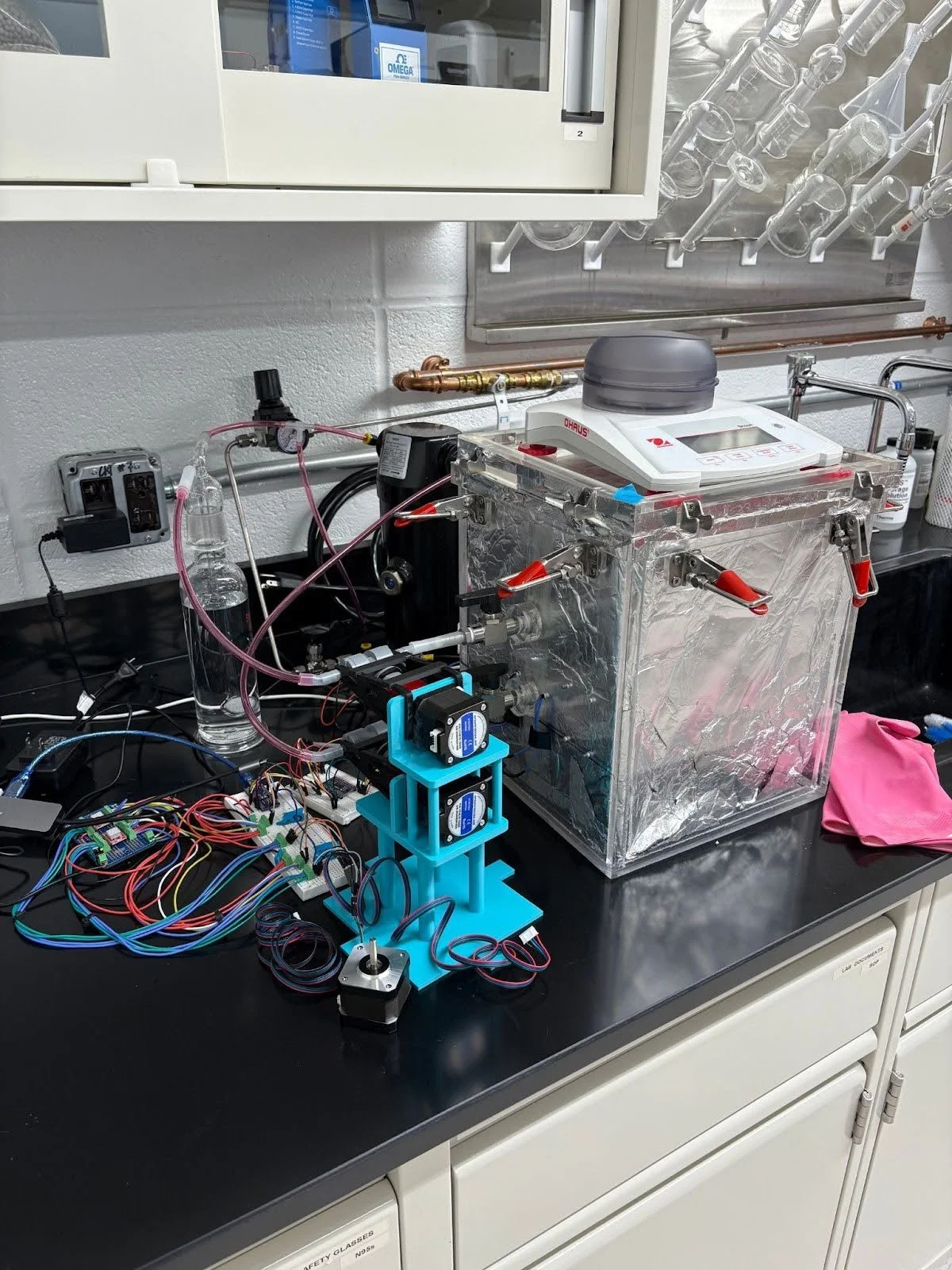 I work at the Nordness group at Columbia, an Earth and Environmental Engineering lab, where I started working in the summer of 2025. I was tasked with automating humidity and temperature control in the environmental control chamber shown below. The chamber is used for atmospheric water harvesting research where we characterize the absorption and desorption performance of novel hygroscopic materials across different temperature and humidity ranges. The previous setup used a hot plate at the bottom of the box to heat the box up; this method was slow, and controlling the temperature was very difficult. For humidity control, a pressure regulator was installed on the central compressed-air supply to reduce line pressure to 1 bar. Downstream of the regulator, a primary needle valve provides overall flow control before the line splits into two branches: one routed through a bubbler to generate humid air, and the other through a desiccant dryer to supply dry air. Each branch has a secondary needle valve for fine flow regulation prior to entering the environmental chamber. Controlling the humidity in an analog manner was difficult and required constant watching and tuning.
