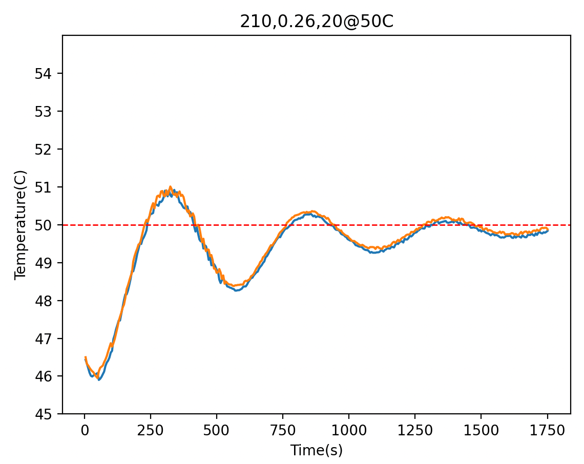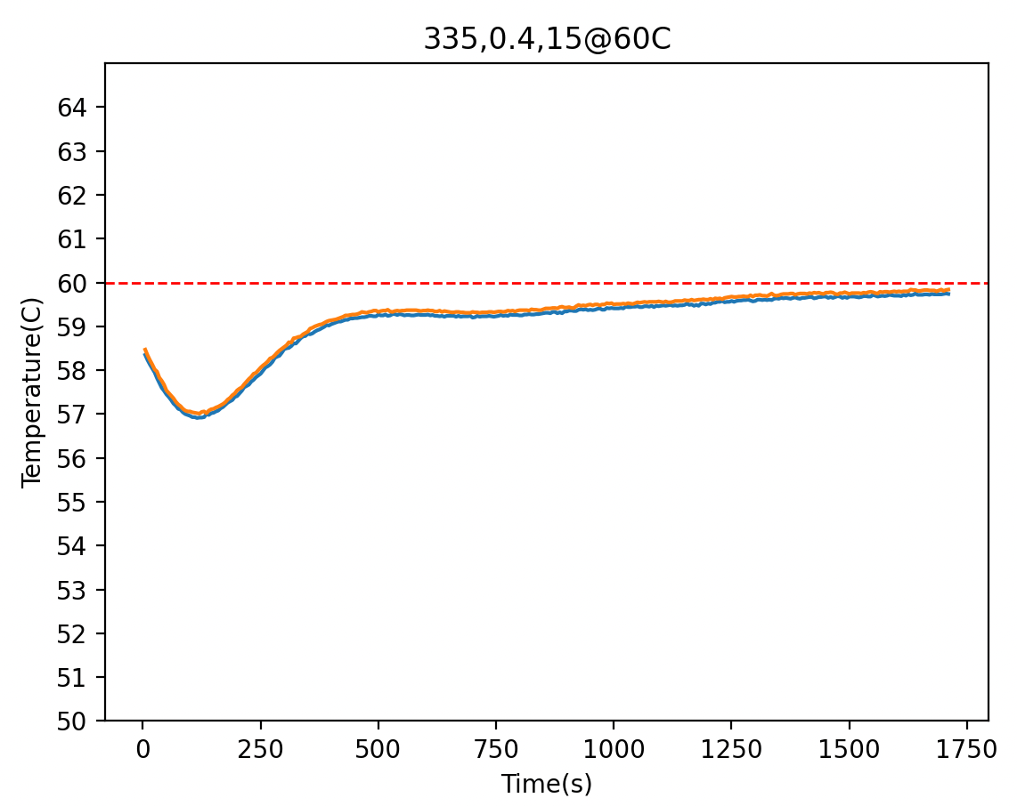 PTC heaters operate in a binary way, so for the control logic, I utilized a time-proportional control scheme. A cycle time of 10s was chosen, and the Arduino computed a PID output that corresponded to how long within each cycle time the heaters should be switched on. Additionally, I used dynamic gains, with different sets of gains for the temperature ranges of [30°C,40°C], (45°C, 55°C], and (55°C, 65°C]. After tuning, the controller could reach a steady state to within half a degree for the range of 30 °C to 65 °C.