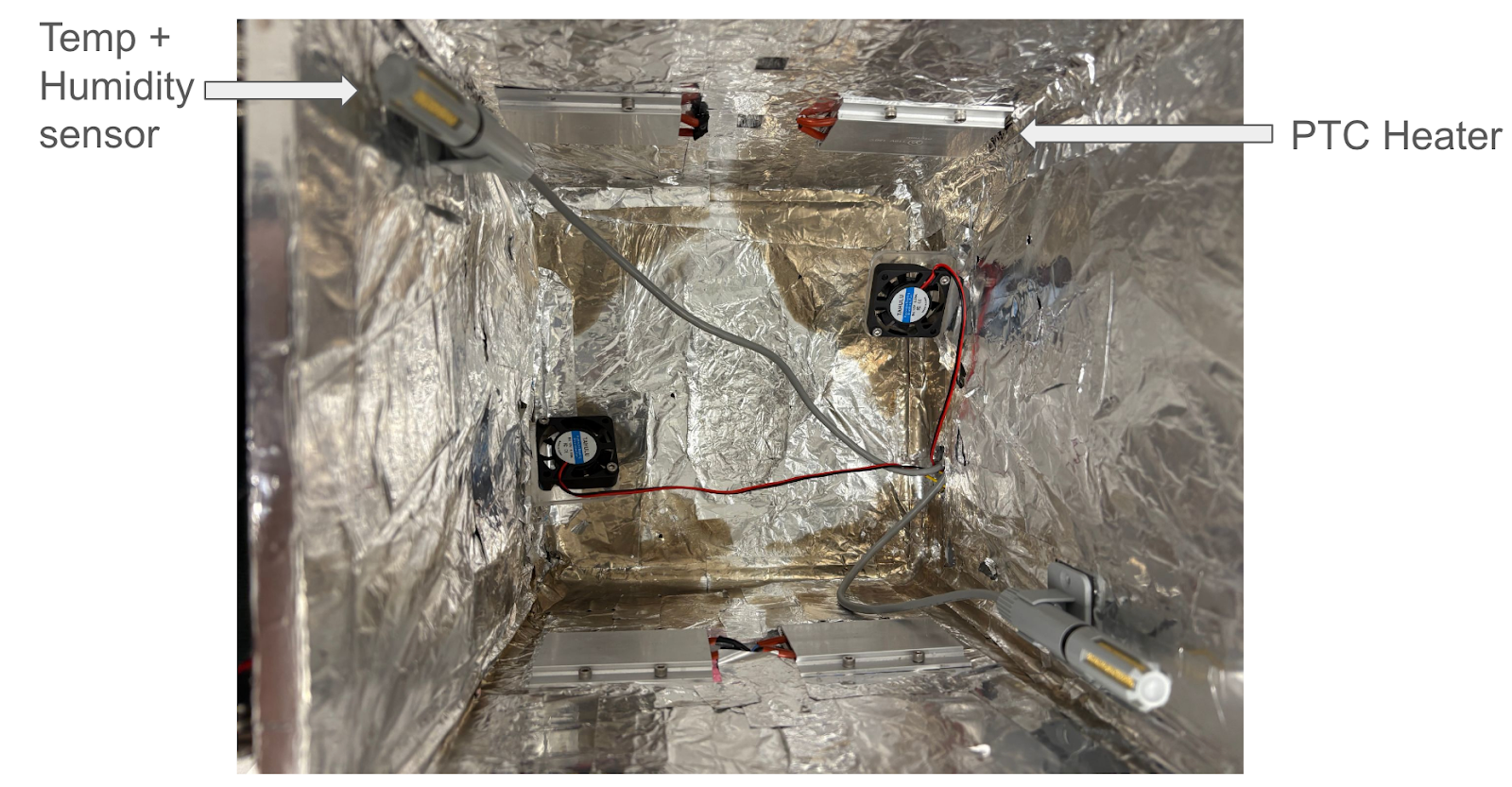I mounted four 110°C PTC (positive temperature coefficient) heaters on opposing walls of the box and connected them in parallel to a solid-state relay, which was connected to a wall outlet. From initial testing, I found that it took too long for the box to heat up, and there was a temperature difference of up to 6°C in opposing corners of the setup. To promote greater convection and fix the temperature gradient problem, I mounted two 40mm fans with custom laser-cut acrylic mounts near the bottom of the box.