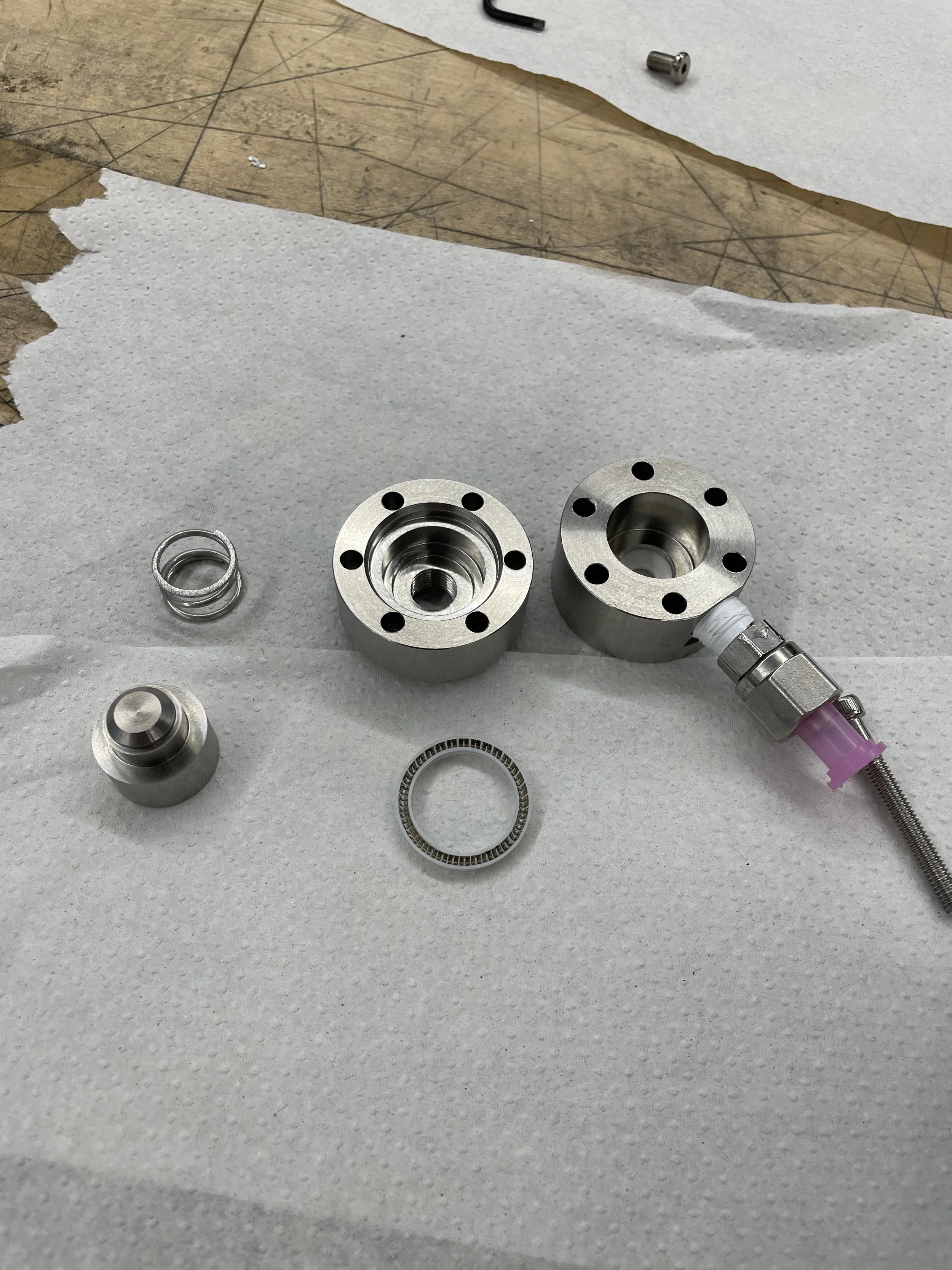 Due to LOX compatibility requirements, aluminum was not an option for materials selection. Instead, everything was machined with 303 stainless steel. Cryogenic temperatures prohibit us from using regular O-rings, so we elected to use PTFE spring-assisted seals for the sealing between the two bodies of the valve. We also machined a PTFE insert for the seal between the piston and tank endcap. Due to the space constraint, instead of creating flanges to put the two halves of our valve together, I opted to add six holes for 8-32 bolts that run through the walls of the valve.